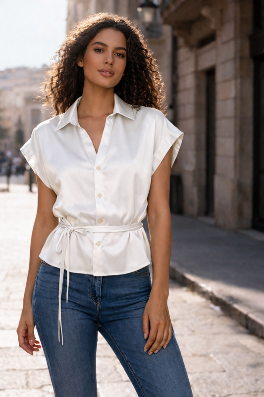 Women’s Satin Tie-Waist Short Sleeve Blouse