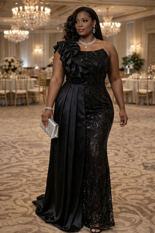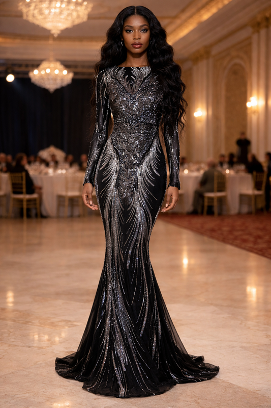 Celeste Noir Crystal-Embellished Long Sleeve Evening Gown