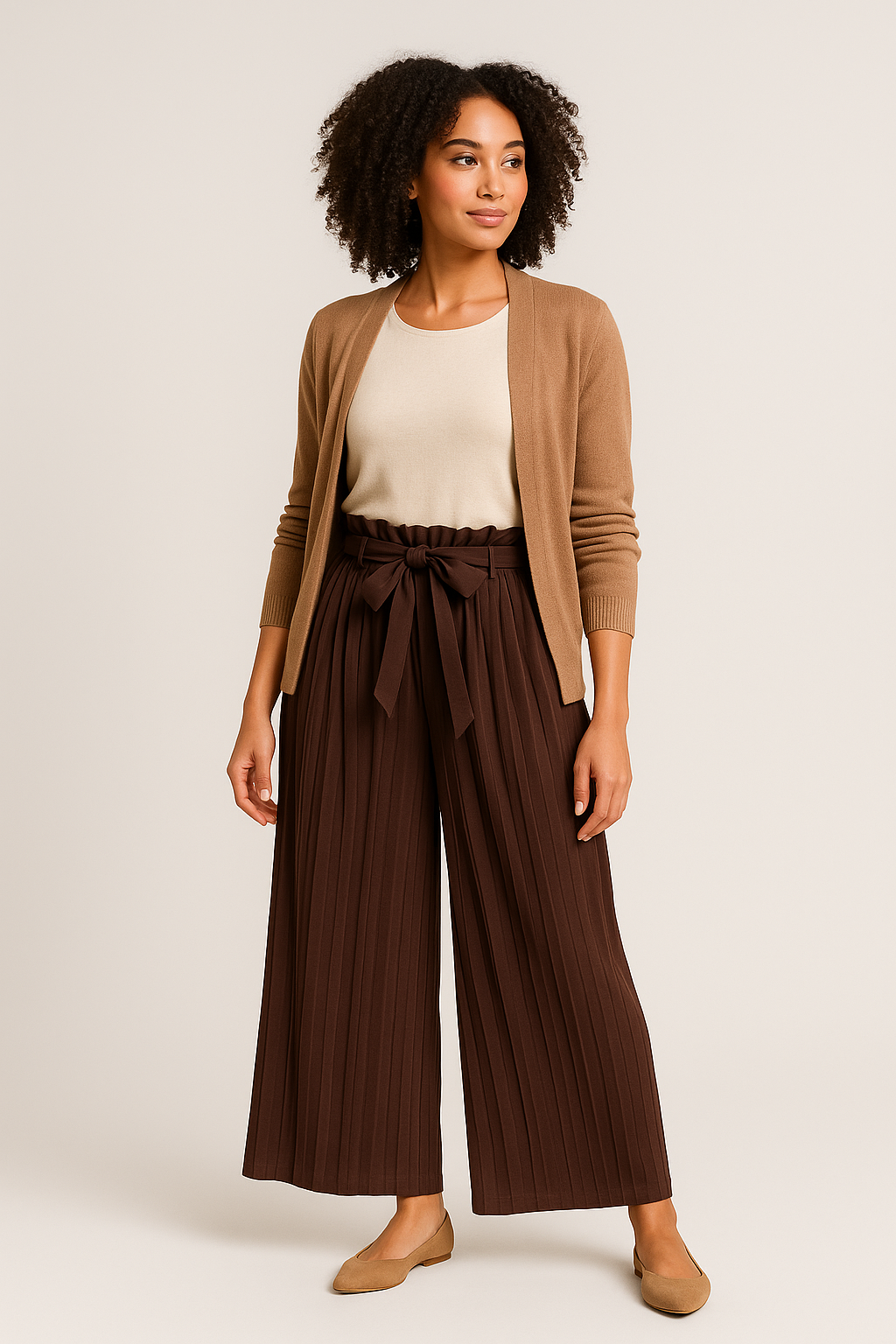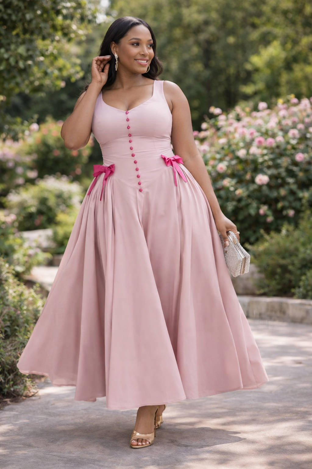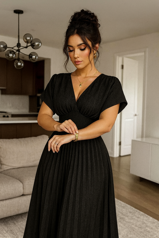 Ember Wear Pleated V-Neck Midi Dress – Flowy Waist-Defined Silhouette
